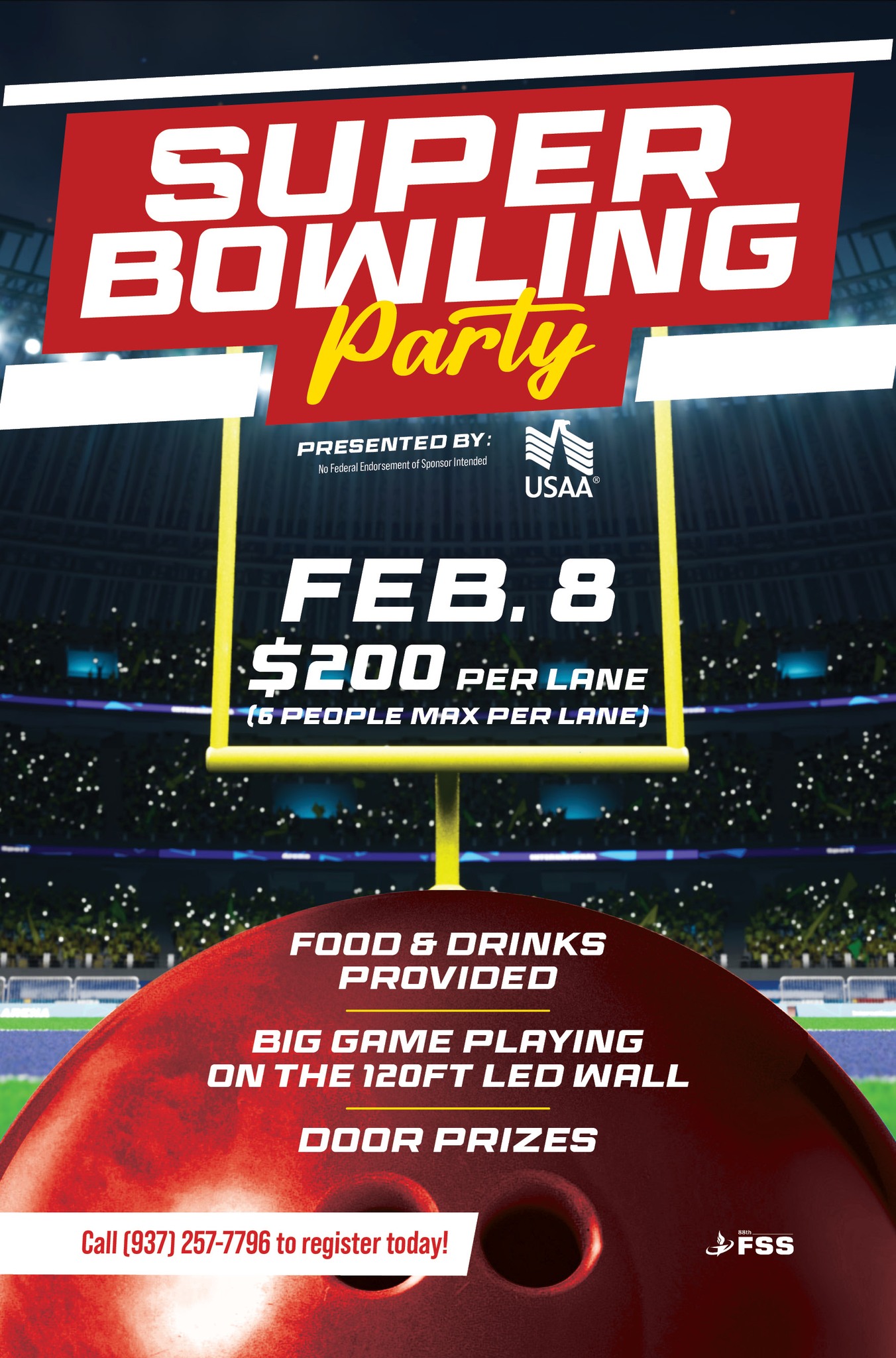 STRIKE A WIN AND DON'T MISS THE PARTY PRESENTED BY USAA! BRING YOUR FRIENDS AND FAMILY AND HAVE A GOOD TIME WATCHING THE BIG GAME ON THE 120FT LED WALL. DOOR PRIZES, FOOD AND DRINKS ARE PROVIDED.