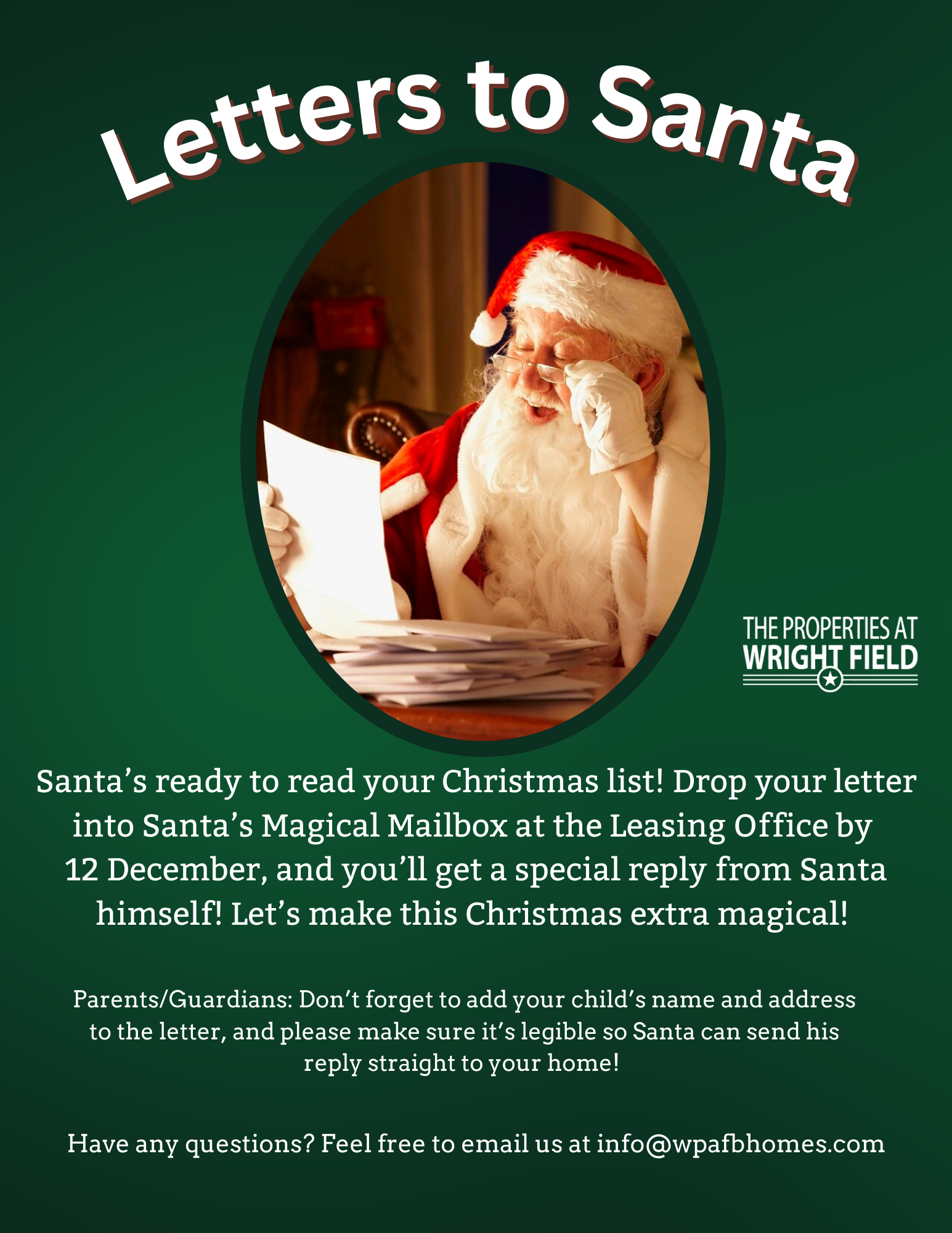 SANTA IS READY TO HEAR FROM YOU! WRITE YOUR CHRISTMAS WISHES AND DROP YOUR LETTER INTO SANTA’S MAGICAL MAILBOX AT THE PWF LEASING OFFICE AT 5924 HICKAM DRIVE!