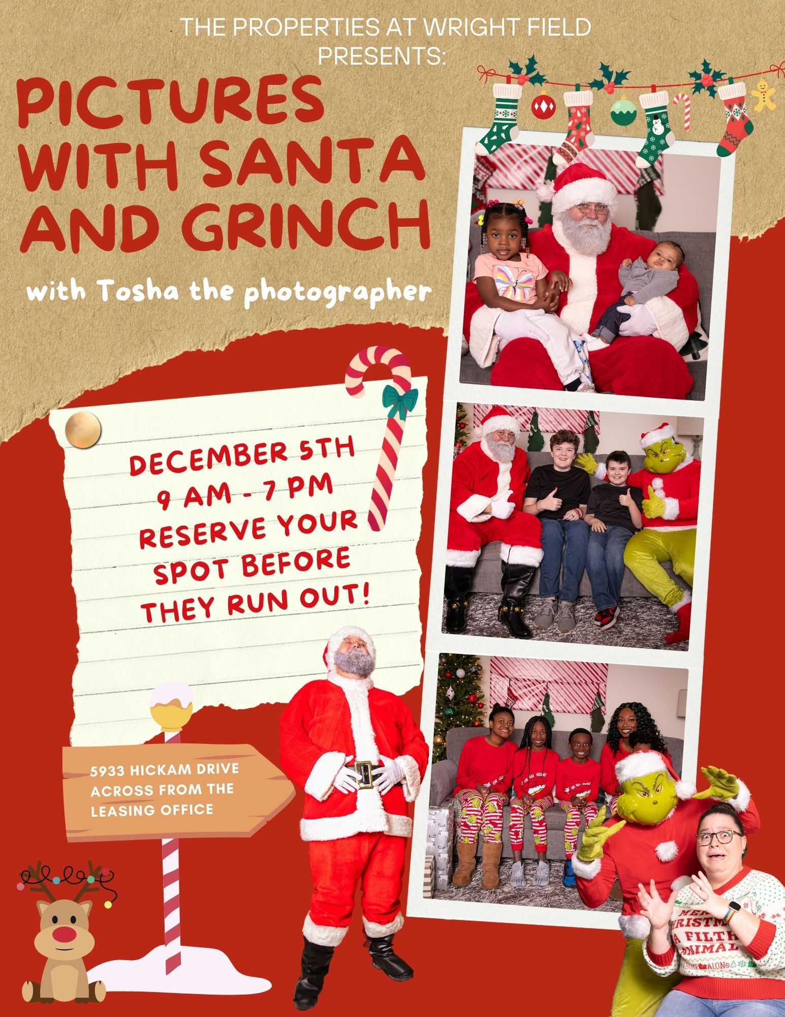 COME JOIN US ACROSS FROM THE PWF LEASING OFFICE AT 5933 HICKAM DRIVE FOR A FESTIVE PHOTO EXPERIENCE WITH SANTA AND THE GRINCH! BRING THE WHOLE FAMILY FOR CHRISTMAS PHOTOS, SMILES, AND A RELAXING TIME MEETING THESE HOLIDAY FAVORITES!