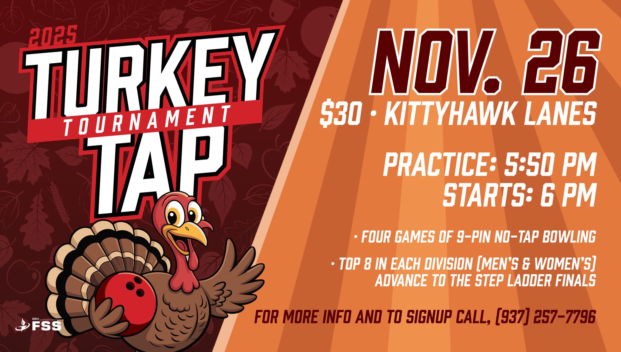THIS TURKEY TAP TOURNAMENT WILL CONSIST OF 4 GAMES OF 9 PIN NO TAP. THE TOP 8 GAMES IN EACH DIVISION WILL ADVANCE. TEAMS WILL BE IN MENS AND WOMENS DIVISION.